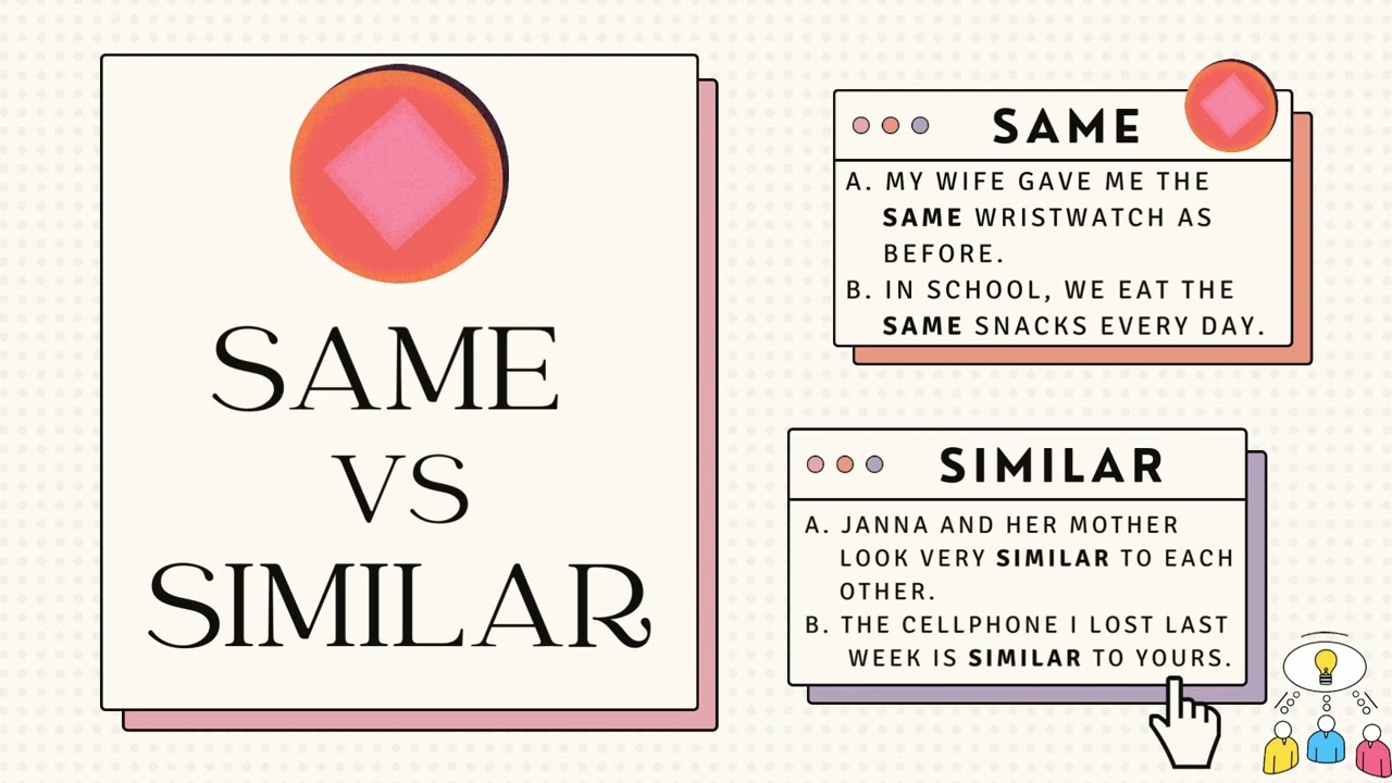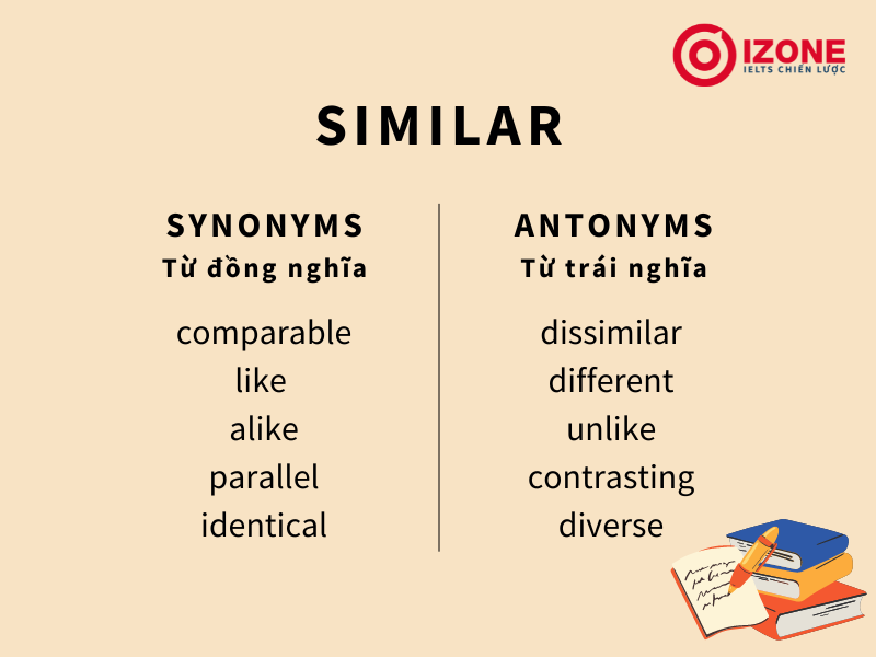 Ngoài “similar,” còn có các từ như “like,” “alike,” và “the same,” nhưng mỗi từ lại mang ý nghĩa và sắc thái riêng. “Like” thường dùng để chỉ tính chất giống nhau trong cảm nhận, trong khi “alike” thường nhấn mạnh sự tương tự trong ngoại hình. Còn “the same” thì biểu thị sự đồng nhất hoàn toàn. Chính vì vậy, việc phân biệt giữa chúng rất quan trọng để diễn đạt ý nghĩa một cách chính xác trong giao tiếp.