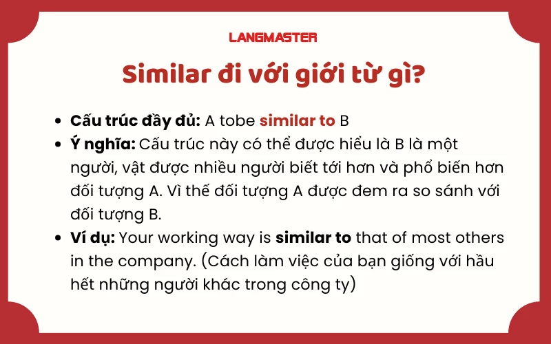 Trong tiếng Anh, “similar to” và “similar with” là hai cụm từ thường gây nhầm lẫn đối với nhiều người học ngoại ngữ. Việc hiểu rõ cách sử dụng và sự khác biệt giữa chúng sẽ giúp bạn giao tiếp tiếng Anh chính xác và tự tin hơn. Bài viết dưới đây sẽ cung cấp định nghĩa, cách dùng, ví dụ minh họa, đồng thời chỉ ra những lỗi thường gặp và các lưu ý quan trọng liên quan đến “similar to” và “similar with”. Hãy cùng tìm hiểu chi tiết để sử dụng hai cụm từ này hiệu quả trong giao tiếp hằng ngày.