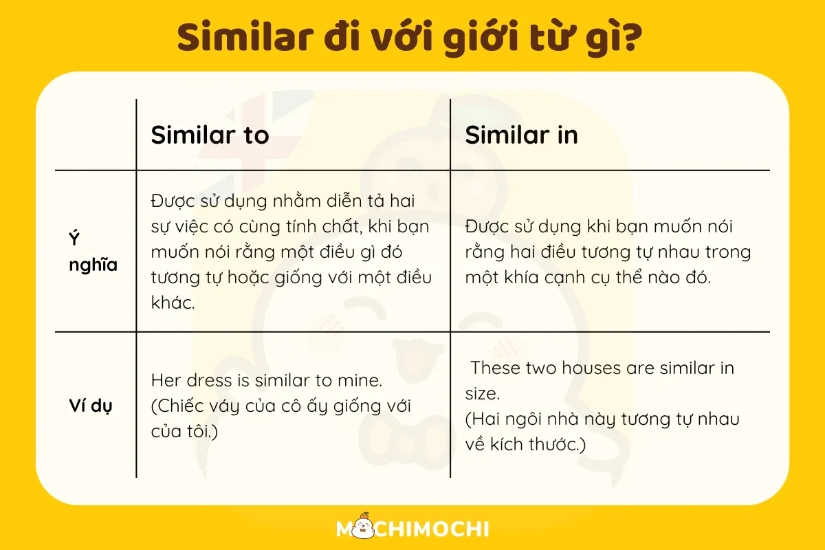 Khi các bạn muốn diễn đạt rằng một đối tượng có điểm giống nhau với một đối tượng khác, hãy lựa chọn “similar to” hoặc “similar in” phù hợp với bối cảnh để tạo ra câu văn tự nhiên và dễ hiểu nhé!