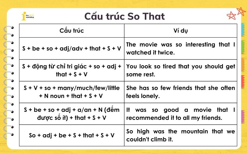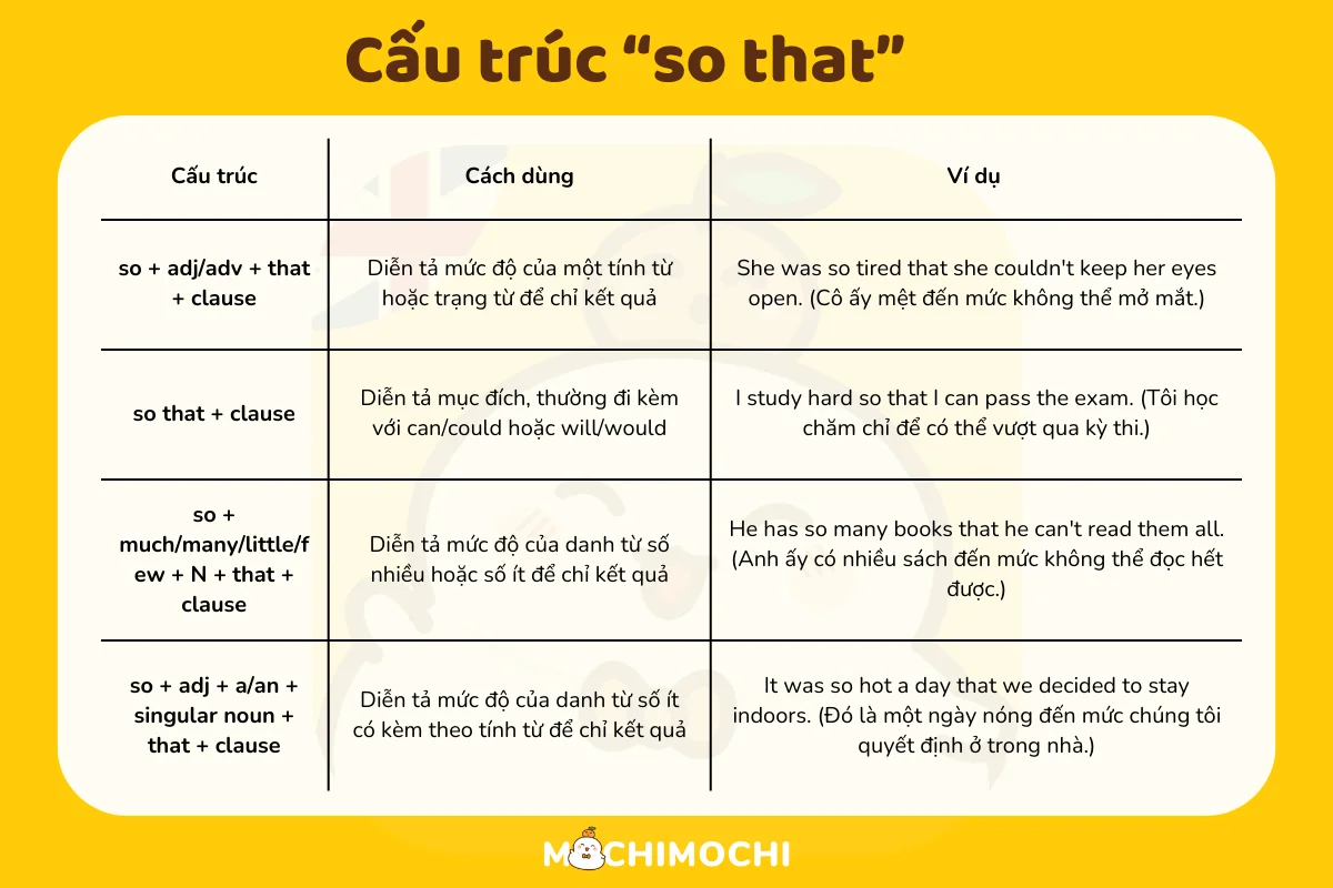 Cấu trúc này cũng thích hợp khi cần chỉ ra mục đích, đặc biệt khi chủ ngữ của hai mệnh đề khác nhau. Điều này giúp câu văn trở nên mạch lạc hơn, minh họa rõ ràng cho ý định của người nói. Nếu bạn đã quen với việc sử dụng các cấu trúc như “such…that”, hãy thử áp dụng “so…that” và “so that” để làm phong phú thêm ngôn ngữ của mình nhé!