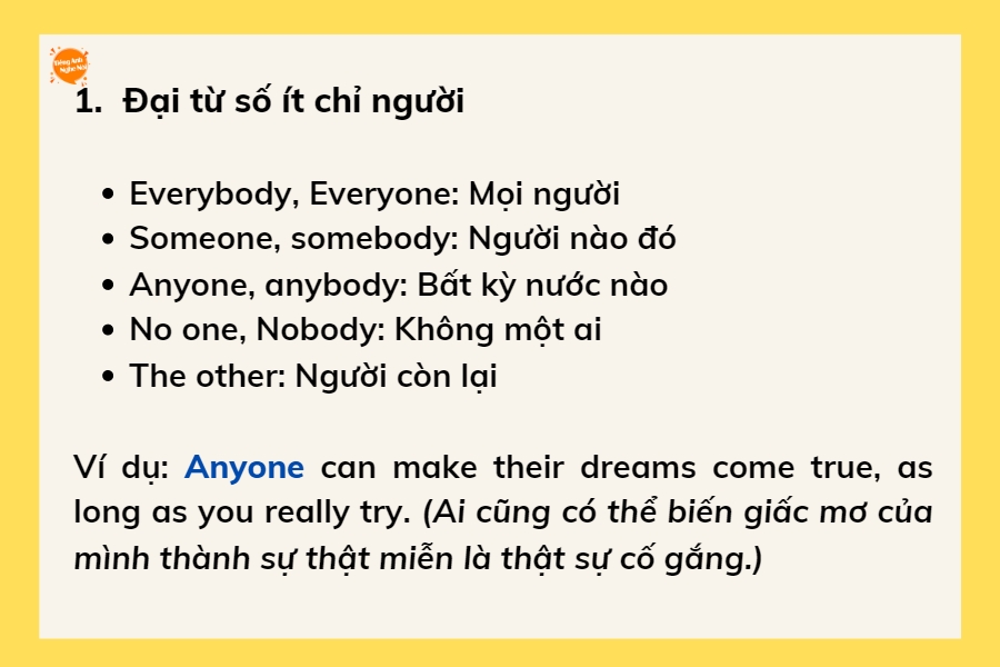 Ngoài “someone”, còn có nhiều đại từ bất định khác như “anyone”, “everybody” và “nobody”. Tất cả những từ này cũng được coi là số ít, nghĩa là chúng sẽ luôn đi với động từ số ít. Việc này không chỉ giúp câu văn trở nên chính xác mà còn làm cho ngữ nghĩa rõ ràng hơn.