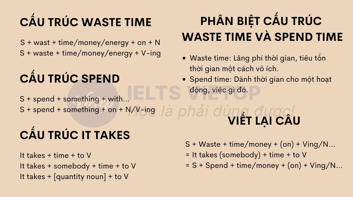 Trong tiếng Anh, có một sự tương đồng giữa “spend” và “waste”. Nếu bạn nói “waste time”, nghĩa là bạn đã tiêu tốn thời gian một cách không hiệu quả. Việc lựa chọn giữa “spend” và “waste” phụ thuộc vào cảm nhận của chúng ta về cách sử dụng thời gian—nó có thể là có ích hoặc không.