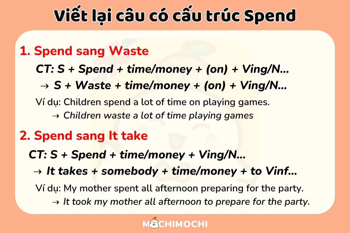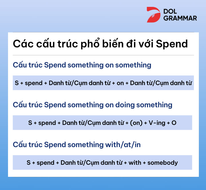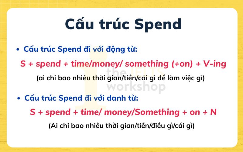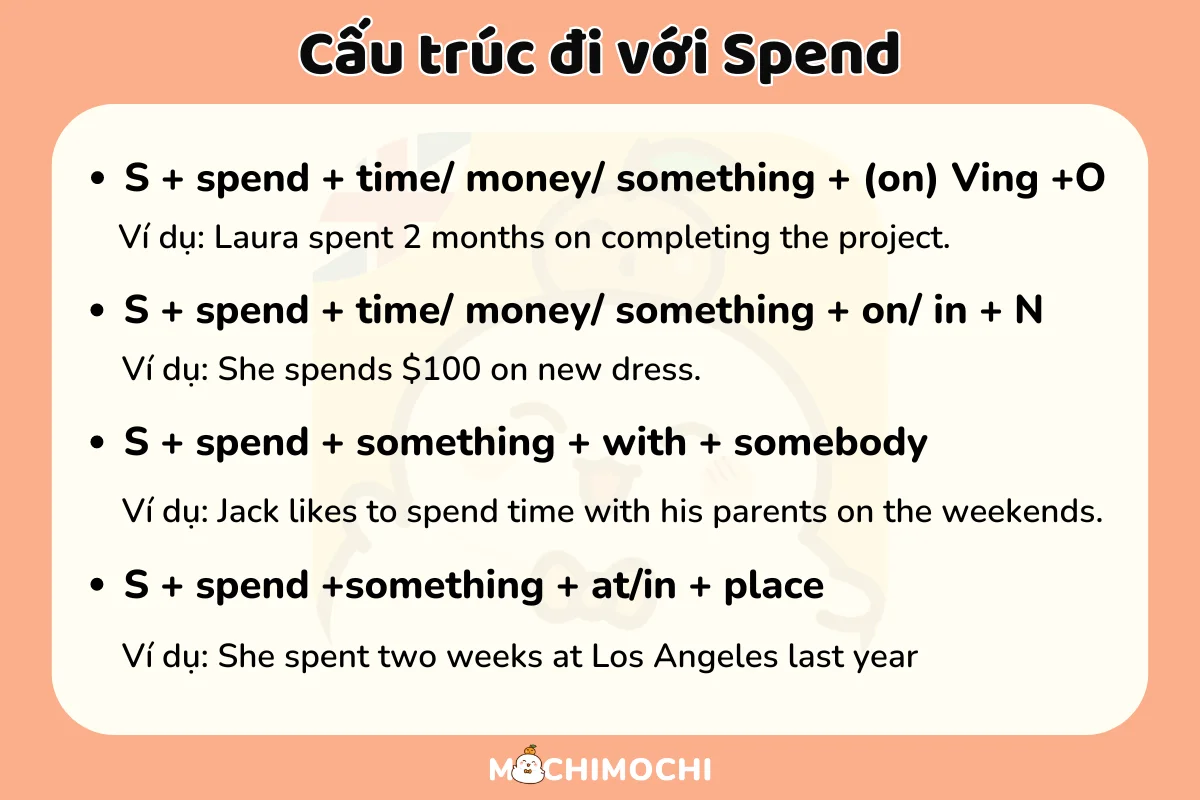 Cuối cùng, “spend” còn có thể đi cùng với “money” để diễn tả việc chi tiêu. Cả hai cấu trúc này đều giúp bạn diễn đạt chính xác hơn trong giao tiếp hàng ngày, từ việc nói về sở thích đến việc chia sẻ về tài chính cá nhân.