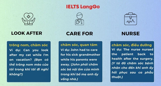 Ngoài ra, bạn có thể thấy “look after” được dùng tương tự với “take care of”, chẳng hạn như “Who’s going to look after the children?”. Điều này cho thấy chúng ta có thể thay đổi cách diễn đạt nhưng vẫn giữ nguyên ý nghĩa.