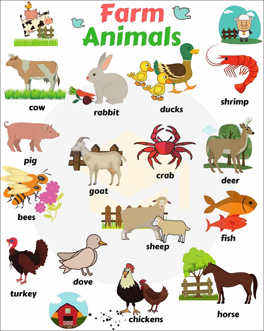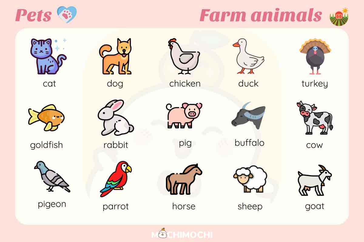 Ngoài thú cưng, còn có nhiều động vật khác mà chúng ta thường thấy trong nông trại. Chẳng hạn như “cow” (bò), “pig” (lợn), “sheep” (cừu) và “chicken” (gà). Những loài động vật này rất quan trọng trong cuộc sống hàng ngày, cung cấp thực phẩm và nguyên liệu cho chúng ta.