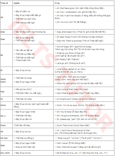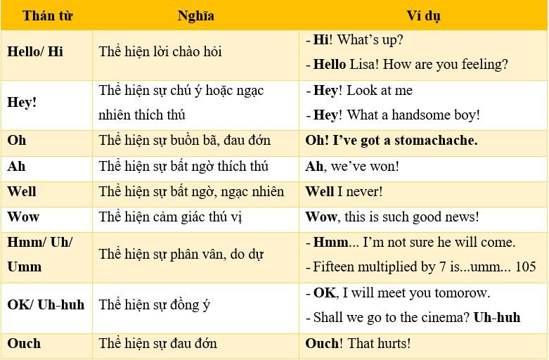 Thán từ, hay còn gọi là interjections, là những từ ngắn được sử dụng để thể hiện cảm xúc hoặc phản ứng tức thì của người nói trong giao tiếp. Chúng có thể bày tỏ sự vui mừng, thất vọng hay ngạc nhiên, ví dụ như “Wow!” hay “Oh no!”. Một điểm khác biệt quan trọng của thán từ so với các từ loại khác là chúng thường xuất hiện độc lập và có thể đứng riêng biệt trong câu mà không cần cấu trúc ngữ pháp phức tạp.