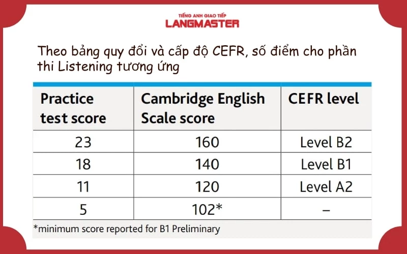 Bài thi tiếng Anh B1 theo khung Châu Âu được tính trên thang điểm 100, với kết quả là ĐẠT hoặc KHÔNG ĐẠT. Để đạt, thí sinh cần có tổng điểm từ 50 trở lên. Cách tính điểm cho từng kỹ năng rất quan trọng: đối với Listening, điểm được tính dựa trên số câu trả lời đúng chia cho 35 và nhân với 10. Tương tự, kỹ năng Reading được tính bằng số câu trả lời đúng chia cho 40, cũng nhân với 10.