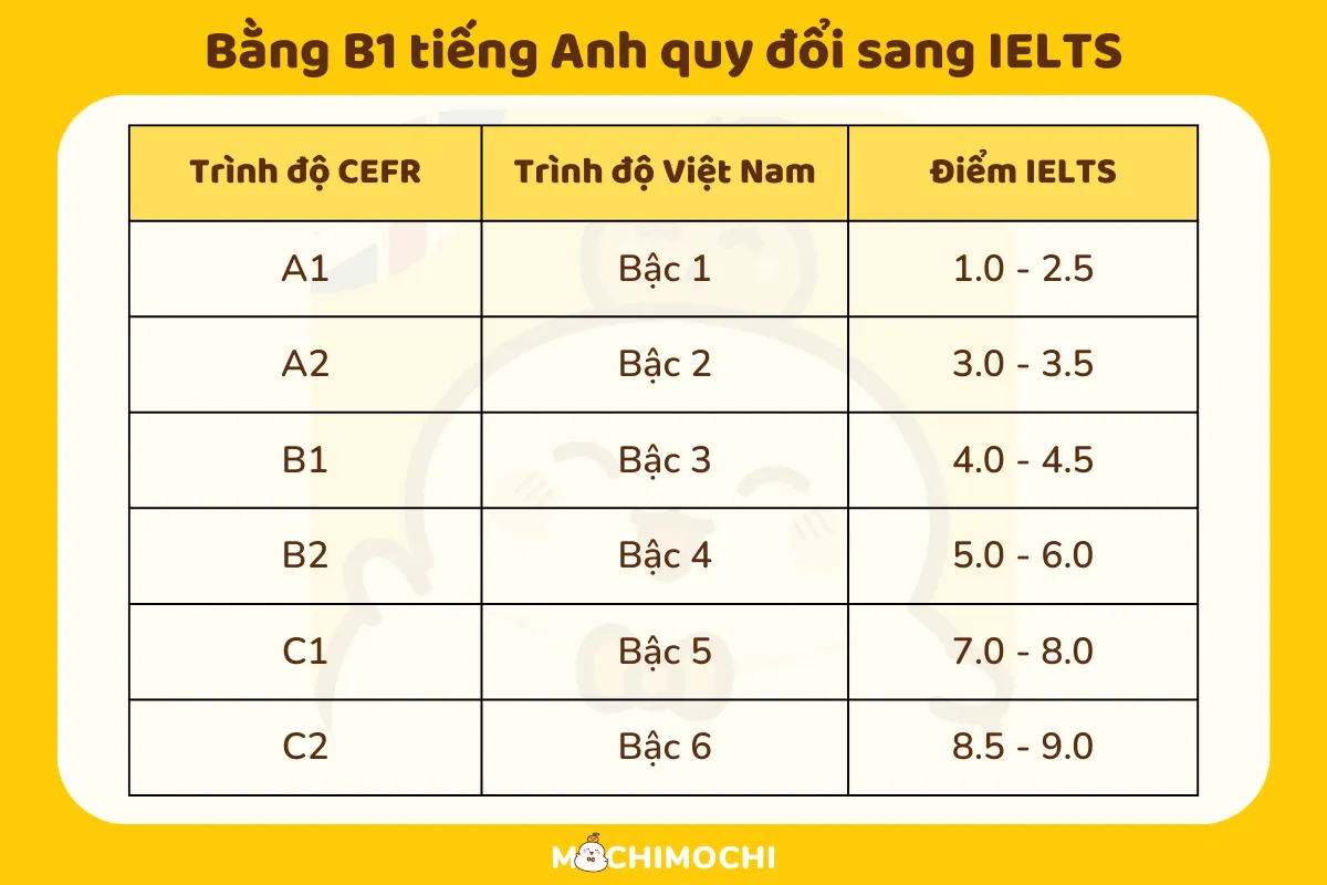 Cụ thể, B1 tương đương với việc có khoảng từ 450 điểm TOEIC hay IELTS từ 4.0 đến 4.5. Để đạt tiêu chuẩn này, bạn cần làm tốt trong cả bốn kỹ năng, và điểm tổng số của chúng sẽ được làm tròn đến 0.5. Hệ thống chấm điểm khá minh bạch và dễ hiểu, giúp thí sinh biết rõ họ đang ở đâu trong quá trình học tiếng Anh.