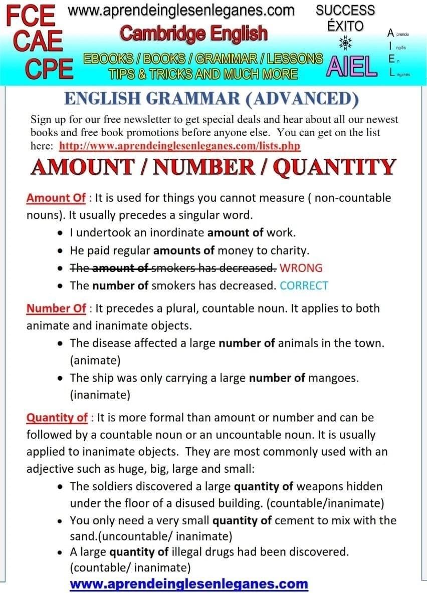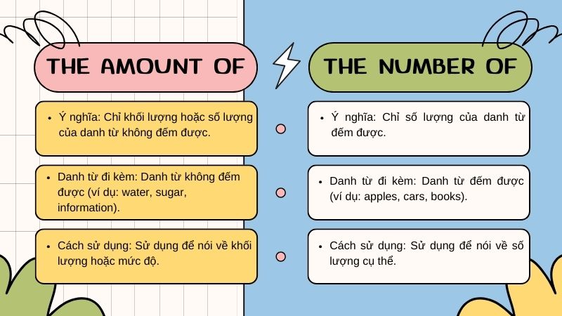 Ngược lại, khi nói về số lượng của danh từ đếm được, chúng ta sẽ dùng “the number of”. Học cách phân biệt hai cấu trúc này sẽ giúp bạn sử dụng tiếng Anh một cách chính xác hơn. Chỉ cần nhớ rằng “the amount of” là bạn đồng hành của những danh từ không đếm được nhé!