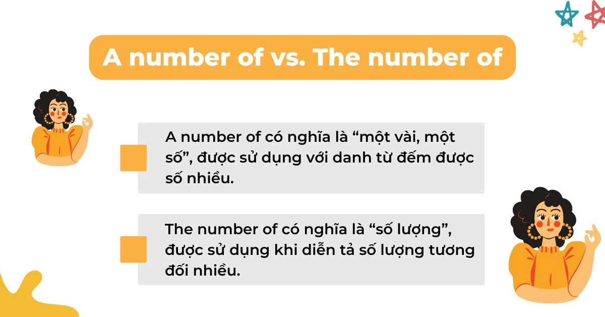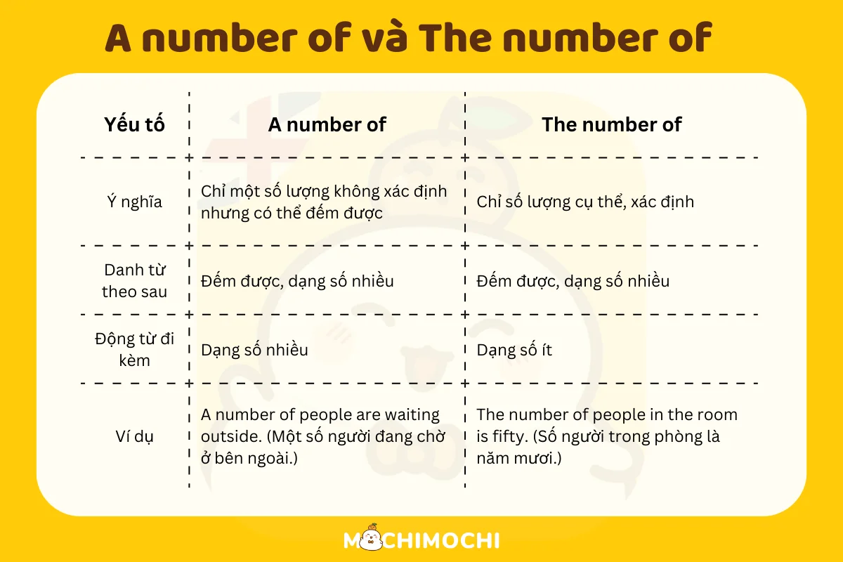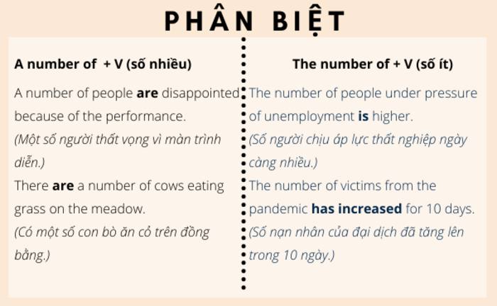 Cụm từ “a number of” và “the number of” thường được sử dụng để chỉ số lượng của một tập hợp người hoặc vật. “A number of” thường chỉ những đối tượng không xác định rõ ràng, như trong câu “A number of students are absent today,” có nghĩa là có một số sinh viên vắng mặt mà không biết chính xác là bao nhiêu. Điều này thường thể hiện tính không cụ thể và dễ dàng áp dụng trong nhiều tình huống.