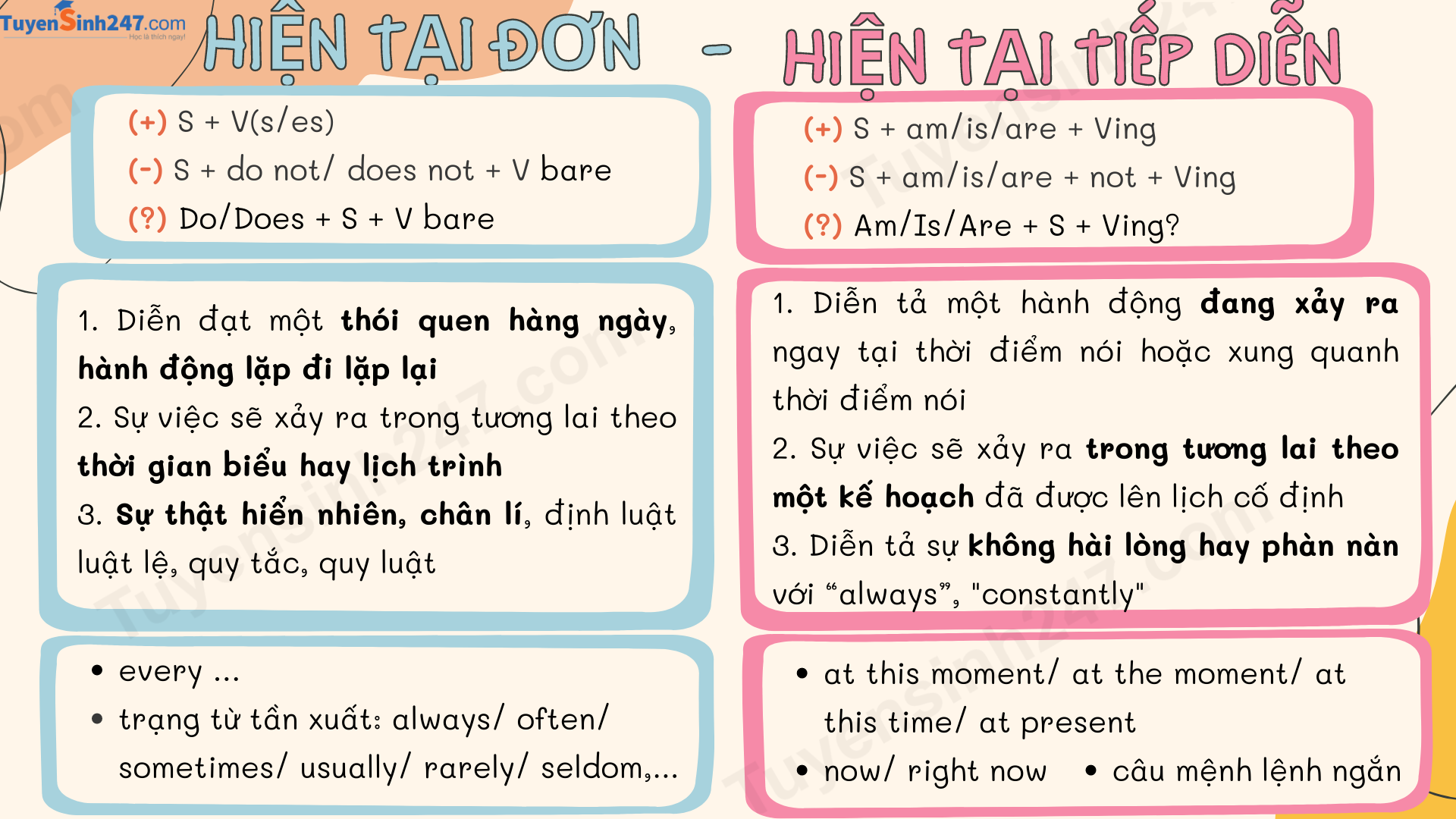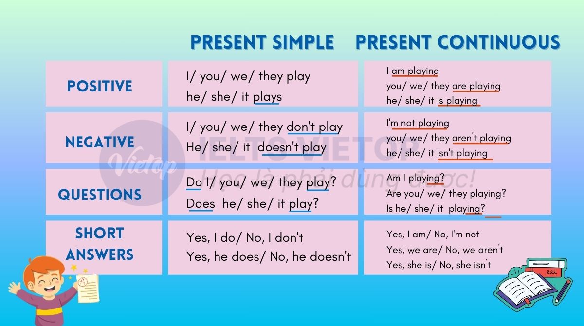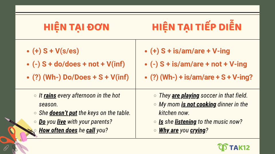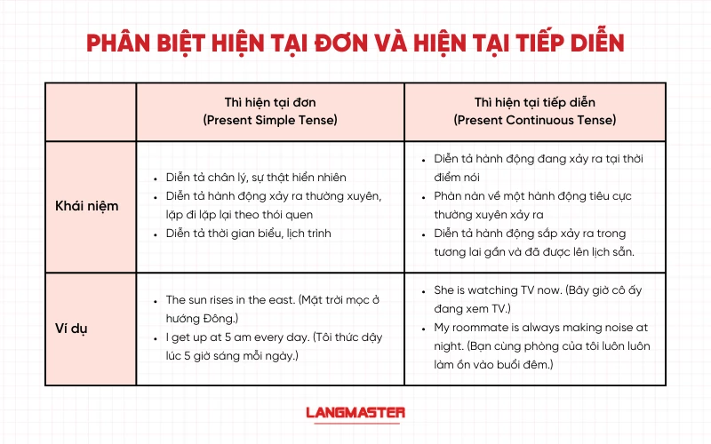 Tiếng Anh có nhiều thì khác nhau, nhưng thì hiện tại đơn và thì hiện tại tiếp diễn là hai thì cơ bản, thường xuyên được sử dụng nhất. Việc nắm chắc kiến thức về hai thì này sẽ giúp bạn nâng cao khả năng giao tiếp, cũng như làm tốt các bài tập ngữ pháp. Trong bài viết dưới đây, chúng ta sẽ cùng tìm hiểu chi tiết về khái niệm, công thức, cách dùng, dấu hiệu nhận biết của thì hiện tại đơn và thì hiện tại tiếp diễn, đồng thời phân biệt chúng qua các ví dụ cụ thể. Cuối bài viết sẽ có các bài tập thực hành giúp bạn củng cố kiến thức.