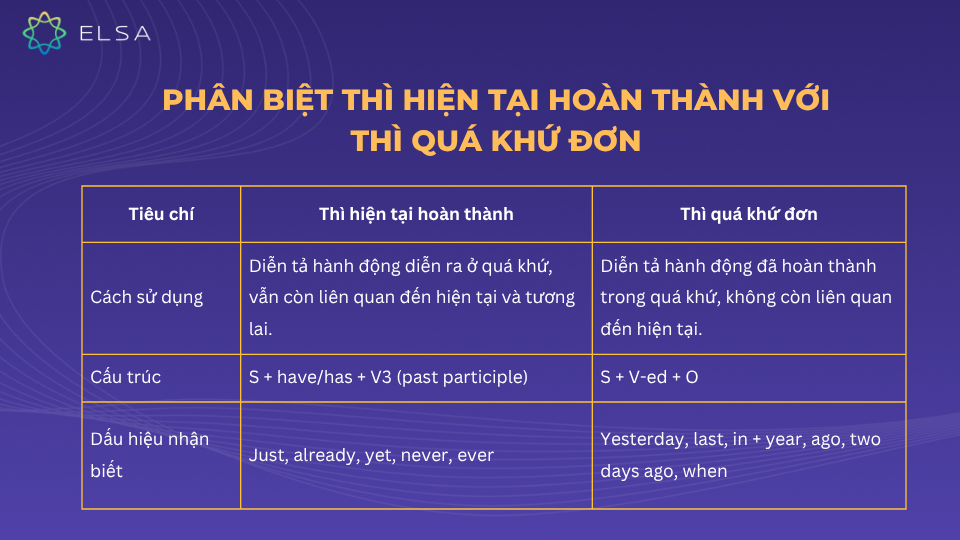 Thì hiện tại hoàn thành (present perfect tense) là một trong những thì cơ bản trong tiếng Anh, thường được sử dụng để diễn tả các hành động đã xảy ra trong quá khứ nhưng vẫn còn liên quan đến hiện tại. Một trong những cách dễ nhận biết thì này chính là vị trí của các trạng từ trong câu. Chẳng hạn, câu “Lan hasn’t told me about you yet” cho thấy rằng hành động “thông báo” vẫn chưa xảy ra cho đến thời điểm hiện tại.