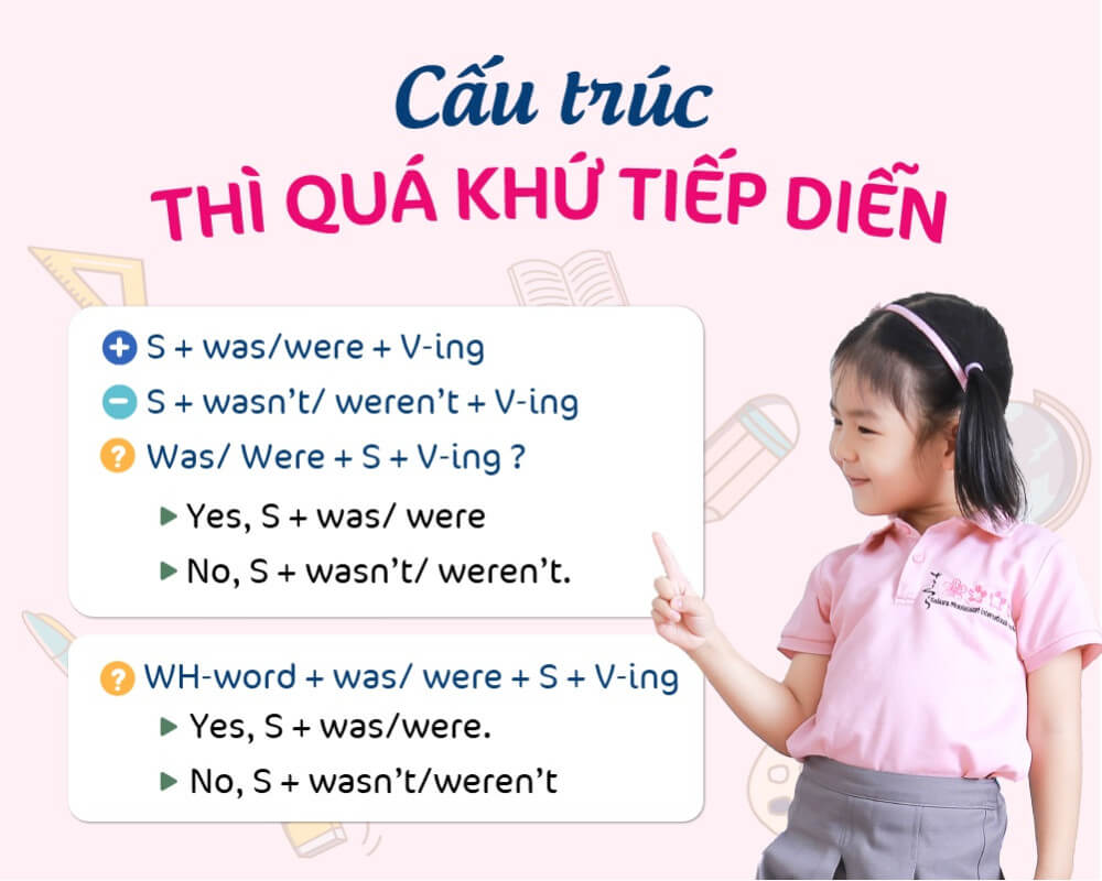 Cấu trúc của thì này rất đơn giản: S + was/were + V-ing. Bạn cần lưu ý rằng “was” được sử dụng với các chủ ngữ số ít như “I,” “he,” “she,” hoặc danh từ số ít, trong khi “were” dùng với chủ ngữ số nhiều.