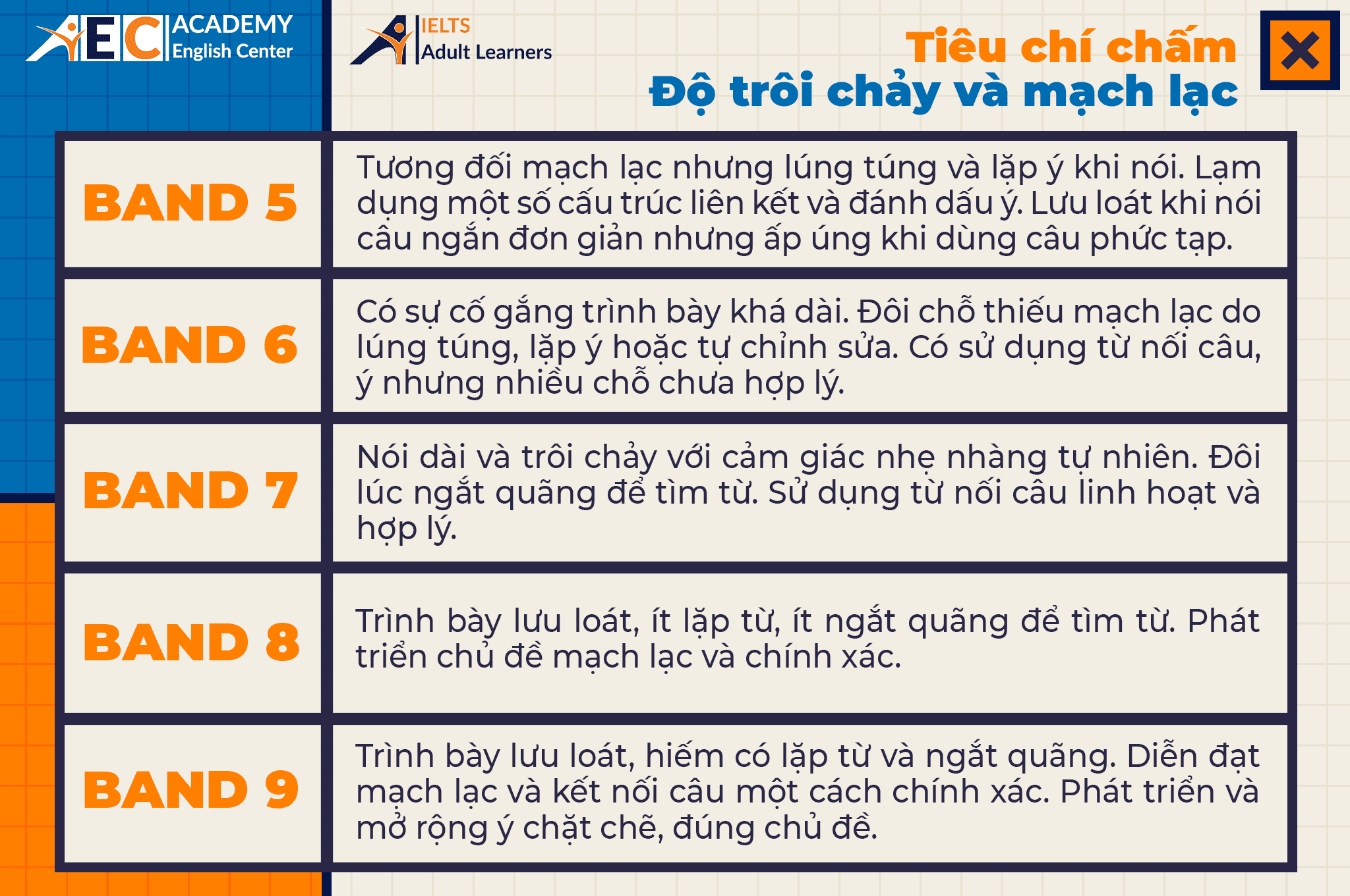 Tiêu chí Fluency and Coherence đóng vai trò quan trọng trong việc đánh giá khả năng nói của một người. Fluency, hay độ trôi chảy, là khả năng nói một cách tự nhiên và mượt mà, không bị ngắt quãng hay do dự quá nhiều. Trong khi đó, coherence, hay độ mạch lạc, liên quan đến việc tổ chức và liên kết các ý tưởng sao cho dễ hiểu và logic. Khi bạn nói, nếu các ý tưởng được kết nối tốt, người nghe sẽ dễ dàng theo dõi và nắm bắt nội dung hơn.