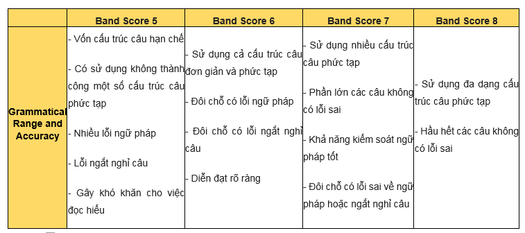 Ngược lại, Grammatical Accuracy tập trung vào việc thí sinh sử dụng các cấu trúc ngữ pháp một cách chính xác. Điều này có nghĩa là việc sử dụng từ vựng, thì, và hình thức câu cần phải đúng ngữ pháp. Việc đạt được điểm số cao trong tiêu chí này không chỉ yêu cầu sự đa dạng mà còn cần phải đảm bảo tính chính xác.