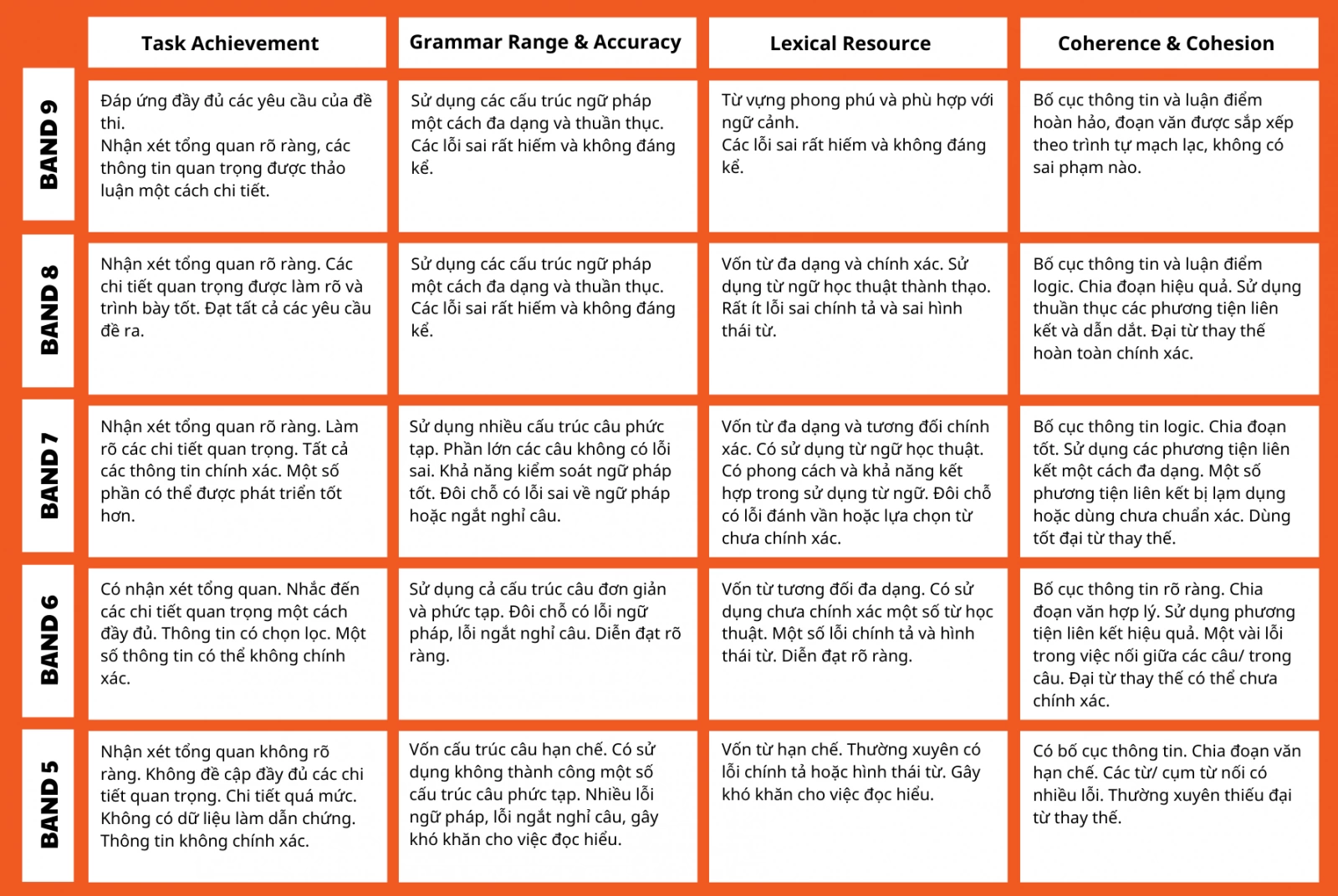 Bài thi IELTS Writing luôn là thử thách đối với nhiều thí sinh bởi yêu cầu cao về kỹ năng tiếng Anh và cấu trúc bài viết. Để đạt được số điểm mong muốn, bạn cần hiểu rõ các tiêu chí chấm điểm cũng như cách đánh giá của giám khảo. Bài viết dưới đây sẽ giúp bạn giải đáp những câu hỏi về tiêu chí chấm Writing IELTS, các tiêu chí đánh giá và band điểm Writing, đồng thời phân tích chi tiết từng tiêu chí quan trọng như Task Achievement, Coherence and Cohesion, Lexical Resource, Grammatical Range and Accuracy… Ngoài ra, bài viết cũng cung cấp thông tin về tiêu chí band 7 và cách chấm điểm riêng cho từng task trong IELTS Writing.