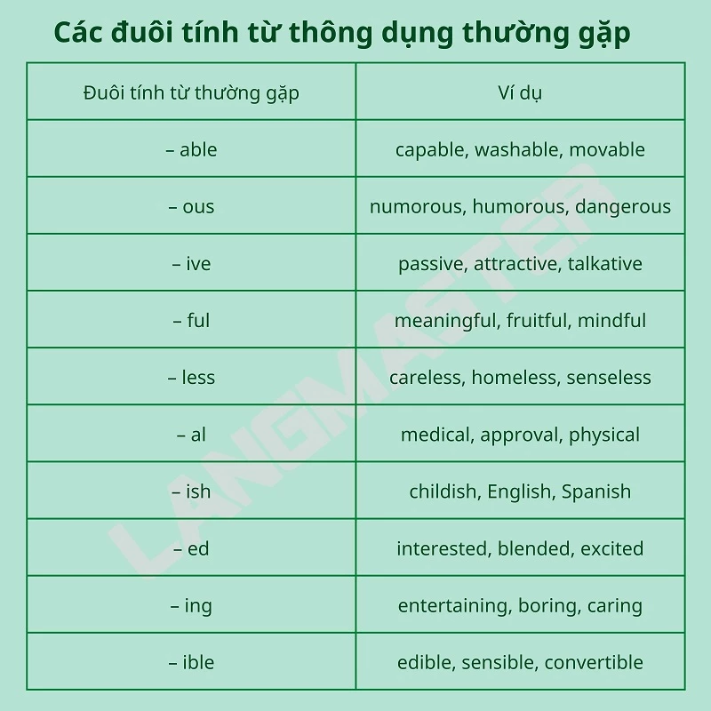 Ngoài ra, một số đuôi khác như “-able,” “-ible,” và “-ous” cũng rất thông dụng trong việc tạo ra tính từ. Những từ như “responsible” hay “comfortable” không chỉ phong phú mà còn giúp làm giàu thêm cho ngôn ngữ của chúng ta. Tính từ thường đứng trước danh từ để mô tả, ví dụ “She has long hair,” giúp chúng ta có cái nhìn rõ ràng hơn về người hoặc vật được nhắc đến. Việc nắm vững cách sử dụng các đuôi này sẽ giúp bạn tự tin hơn trong việc diễn đạt ý tưởng bằng tiếng Anh.