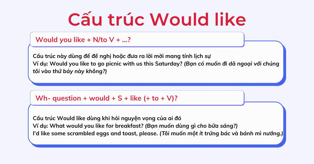 Đáp lại lời mời này, người khác có thể nói: “Yes, I’d love to,” nếu họ chấp nhận, hoặc “No, I already have one,” nếu họ đã có kế hoạch khác. Ngoài ra, “would you like” còn có thể được sử dụng để hỏi về nguyện vọng, mong muốn của người khác. Ví dụ, một câu hỏi như “Would you like a glass of mango smoothie?” không chỉ đơn thuần là hỏi về sở thích mà còn thể hiện sự quan tâm đến cảm giác của người được hỏi.
