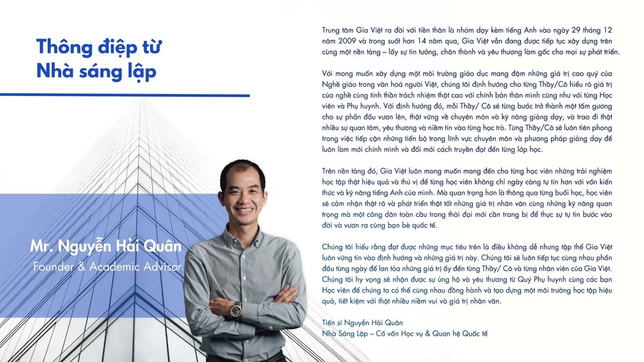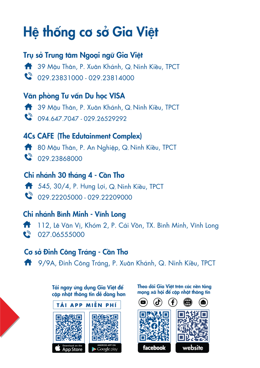 Như vậy, Trung Tâm Anh Ngữ Gia Việt không chỉ mang đến cho học viên một môi trường học tập chuyên nghiệp và năng động mà còn chú trọng đến việc cung cấp mức học phí hợp lý và minh bạch. Điều này giúp các bậc phụ huynh yên tâm hơn khi đầu tư cho sự phát triển của con em mình. Với sự tận tâm từ đội ngũ giáo viên và chương trình giảng dạy linh hoạt, trung tâm cam kết sẽ giúp học viên xây dựng nền tảng tiếng Anh vững chắc, mở rộng cơ hội học tập và phát triển trong tương lai. Hãy đến với Gia Việt để trải nghiệm sự khác biệt!