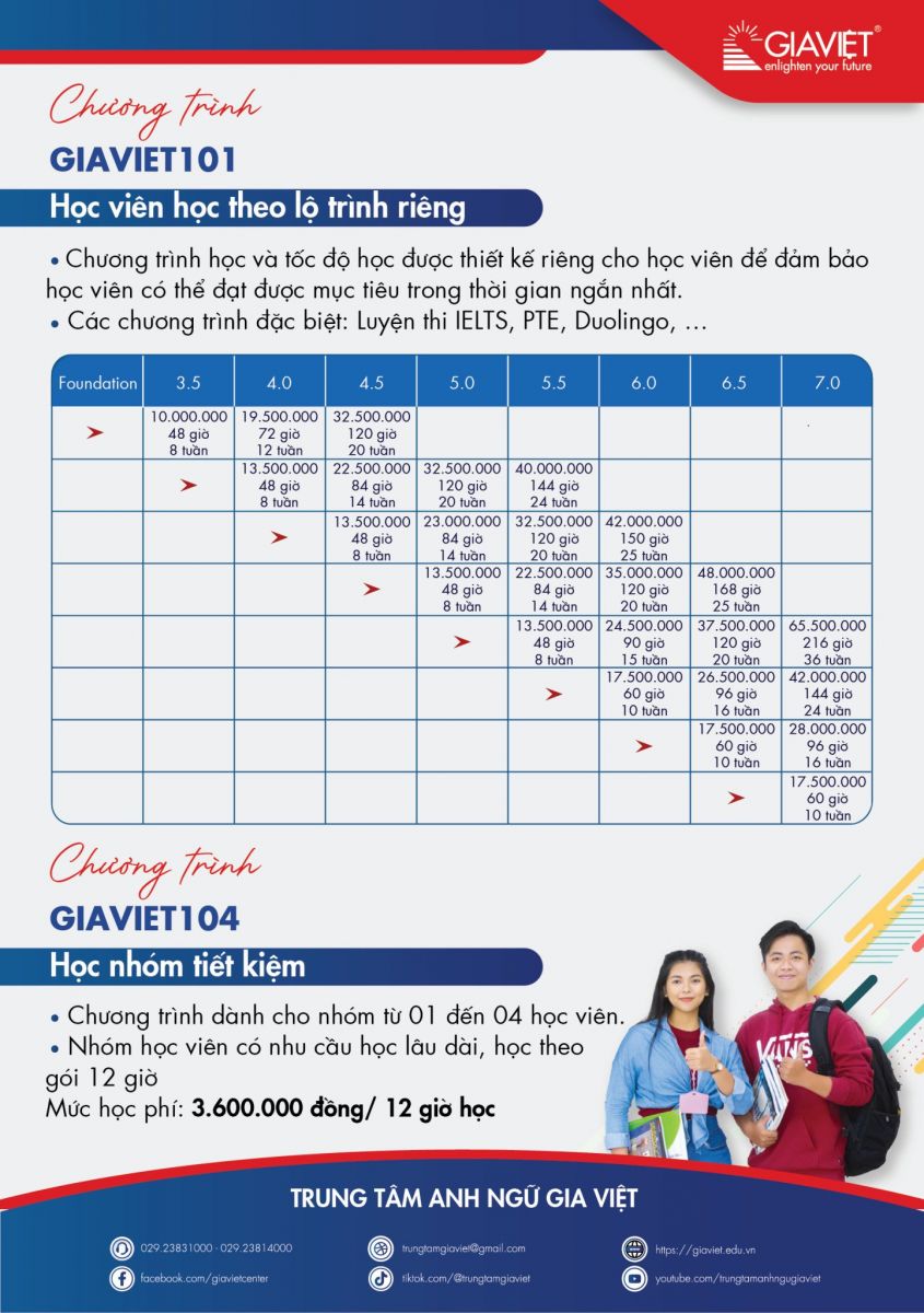 Bảng Học Phí Trung Tâm Anh Ngữ Gia Việt