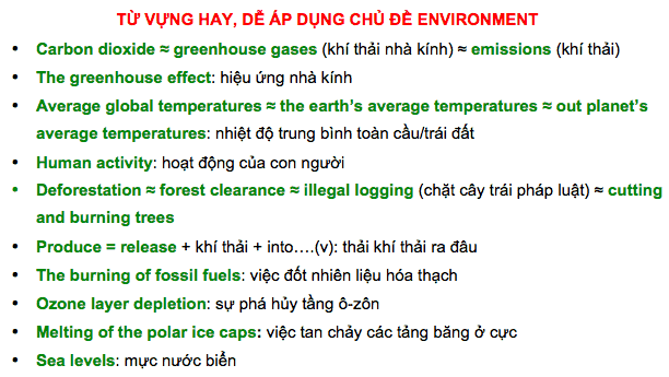 Môi trường hiện nay đang đối mặt với nhiều vấn đề nghiêm trọng. Nguyên nhân hàng đầu gây ra những vấn đề này chính là biến đổi khí hậu (climate change), một hiện tượng do con người tạo ra, chủ yếu qua việc thải ra lượng lớn khí nhà kính từ việc đốt nhiên liệu hóa thạch. Sự nóng lên toàn cầu không chỉ dẫn đến thời tiết cực đoan mà còn gây ra các thảm họa thiên nhiên (natural disasters) như lũ lụt, bão tố và hạn hán.