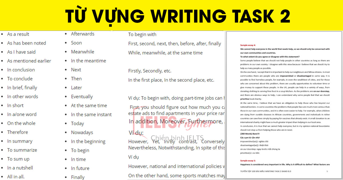 Ngoài ra, bạn nên chú ý đến việc sử dụng từ nối để liên kết các ý tưởng. Một số từ nối phổ biến như “Firstly”, “Moreover”, hay “On the other hand” sẽ làm cho bài viết trở nên liền mạch và logic hơn. Tổng hợp hơn 500 từ vựng nâng cao theo 15 chủ đề thường gặp trong IELTS sẽ giúp bạn tự tin hơn khi bước vào phòng thi.