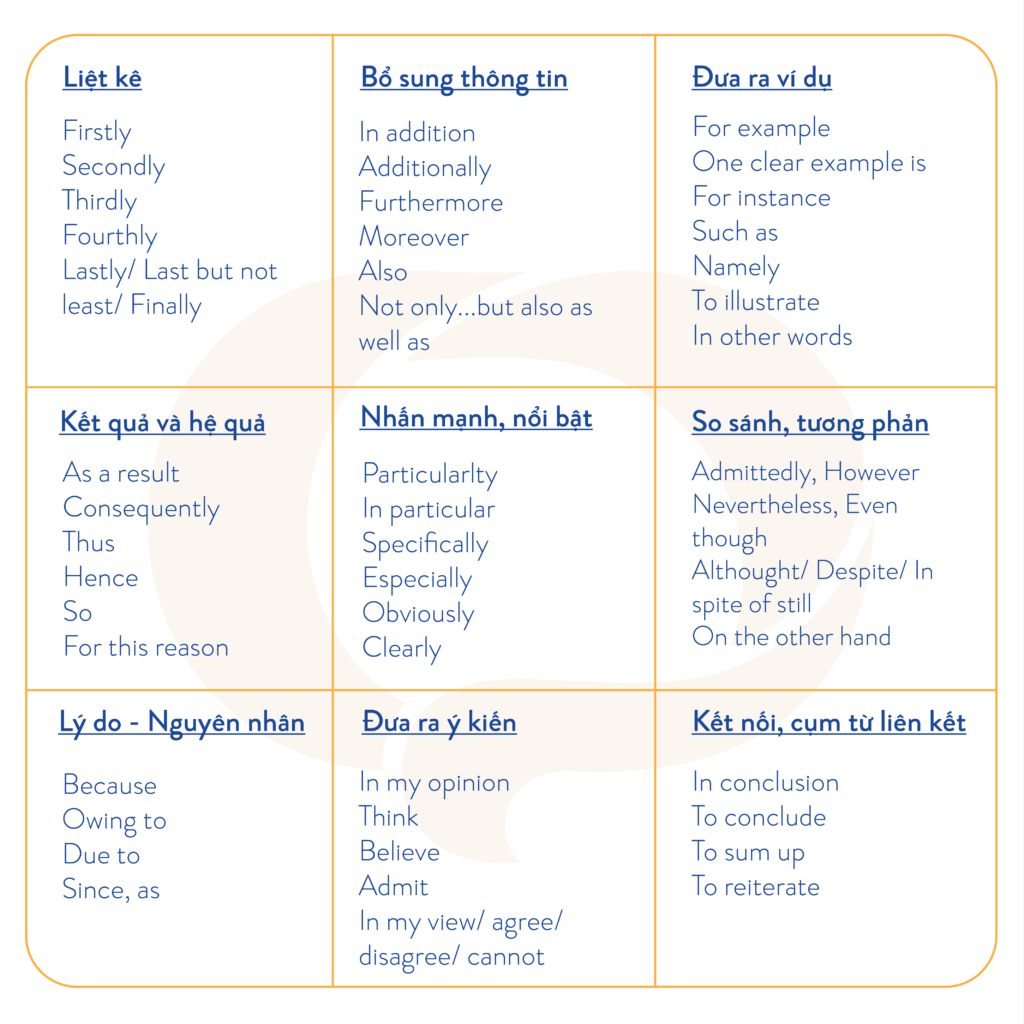 Ngoài ra, việc sử dụng từ nối là rất cần thiết để làm cho bài viết mạch lạc hơn. Các từ nối chỉ trình tự như “firstly,” “next,” hay “finally” giúp bạn tổ chức ý tưởng một cách rõ ràng. Bên cạnh đó, để bổ sung thêm thông tin, bạn có thể áp dụng các cụm từ như “in addition,” hay “moreover.”
