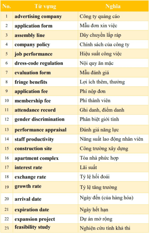 Trong môi trường văn phòng, có nhiều từ vựng thông dụng mà bạn nên biết. Ví dụ, “associate” có nghĩa là đồng nghiệp, rất cần thiết khi bạn làm việc nhóm. Bên cạnh đó, các từ như “mailroom” (phòng văn thư), “upgrade” (nâng cấp) hay “break room” (phòng nghỉ) cũng xuất hiện thường xuyên trong môi trường làm việc hàng ngày. Nếu bạn muốn cải thiện kỹ năng ngôn ngữ của mình, hãy chú ý đến những từ như “organize” (tổ chức) hay “attend” (tham dự) vì chúng rất hữu ích trong các cuộc họp và sự kiện.
