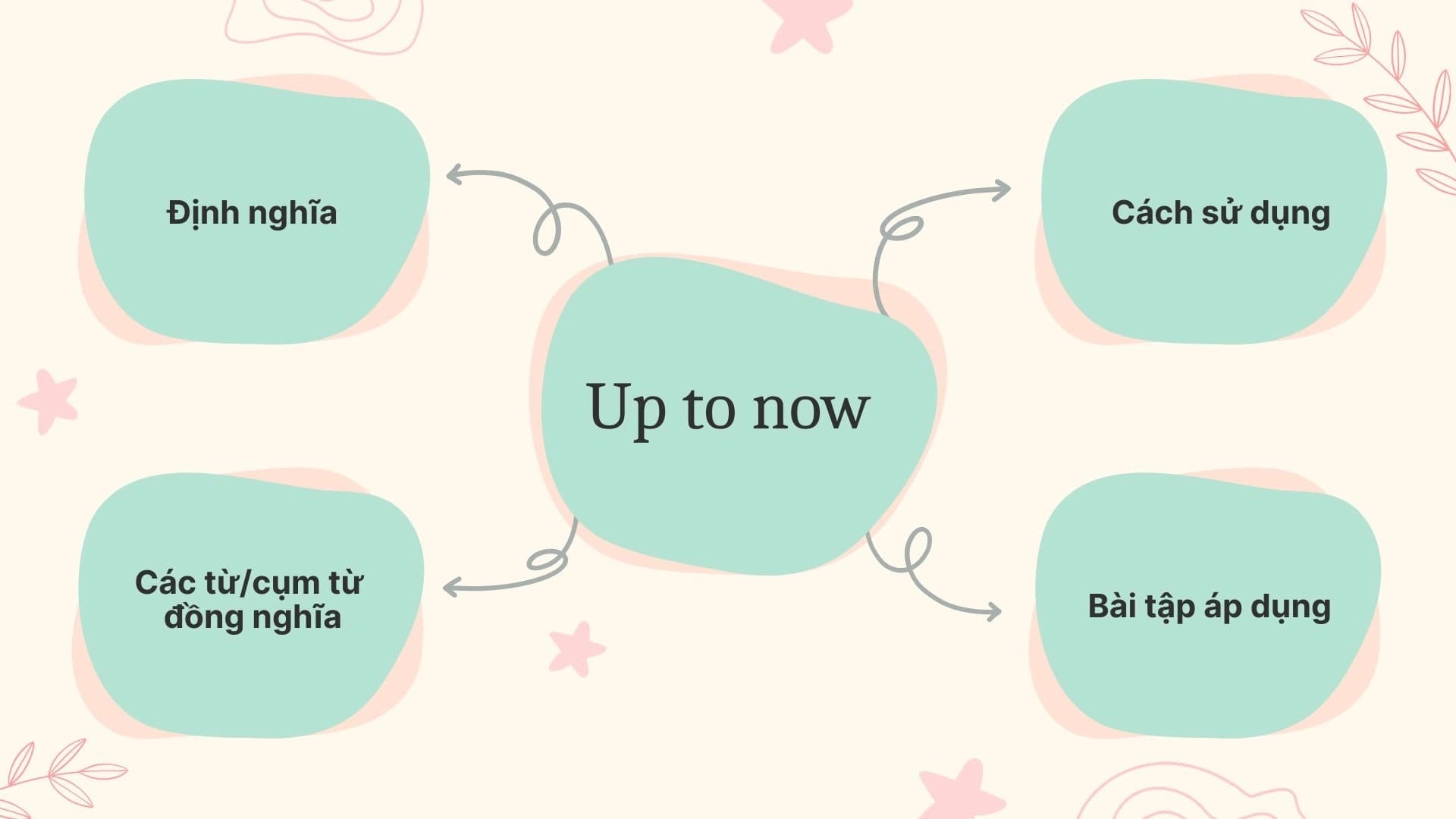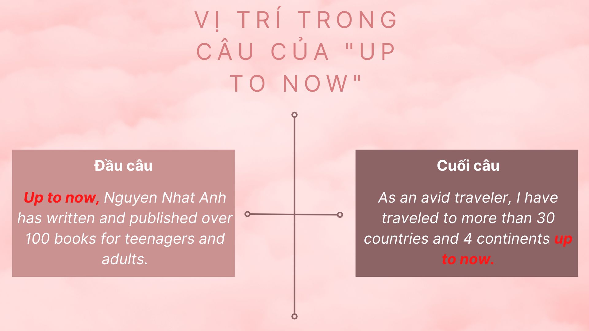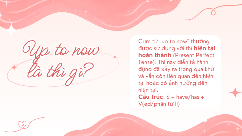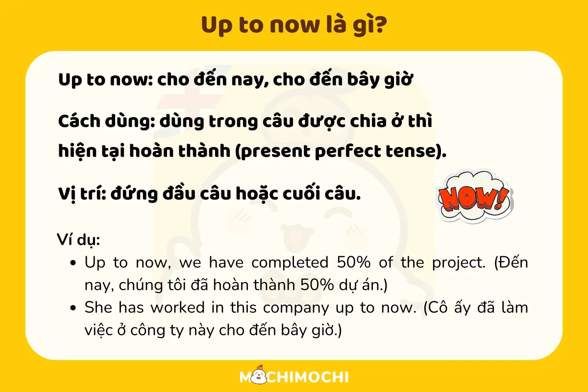 “Up to now” là một cụm từ rất hữu ích trong tiếng Anh, đặc biệt khi bạn muốn diễn tả những hoạt động đã bắt đầu trong quá khứ và vẫn tiếp tục đến hiện tại. Nghĩa của nó tương đương với “đến nay” hay “cho đến bây giờ”. Bạn có thể dễ dàng nhận biết thì hiện tại hoàn thành thông qua cụm từ này.