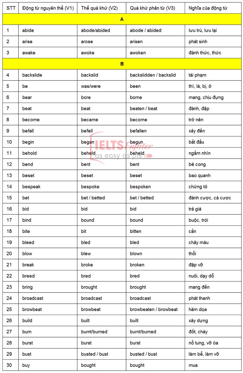 Bảng tổng hợp động từ bất quy tắc trong tiếng Anh rất quan trọng đối với việc học ngôn ngữ, đặc biệt là cho học sinh cấp 2. Với hơn 360 động từ phổ biến được tổ chức rõ ràng qua ba dạng: động từ nguyên mẫu (V1), thể quá khứ (V2) và quá khứ phân từ (V3), bảng này giúp học sinh dễ dàng tra cứu và ghi nhớ. Ví dụ, động từ “abide” có các dạng “abode/abided” và “abode/abided”, trong khi động từ “awake” được chia thành “awoke” và “awoken”.