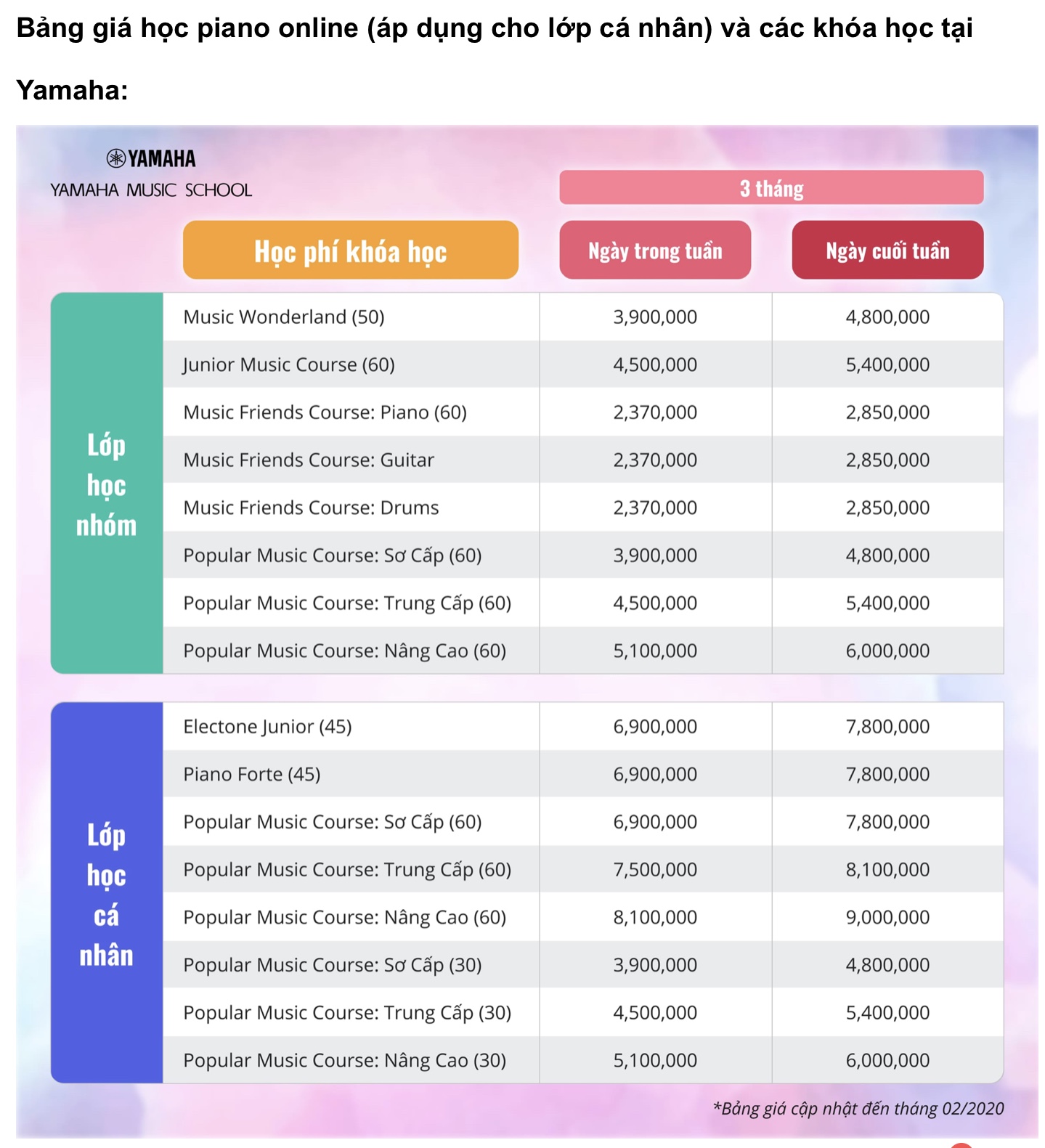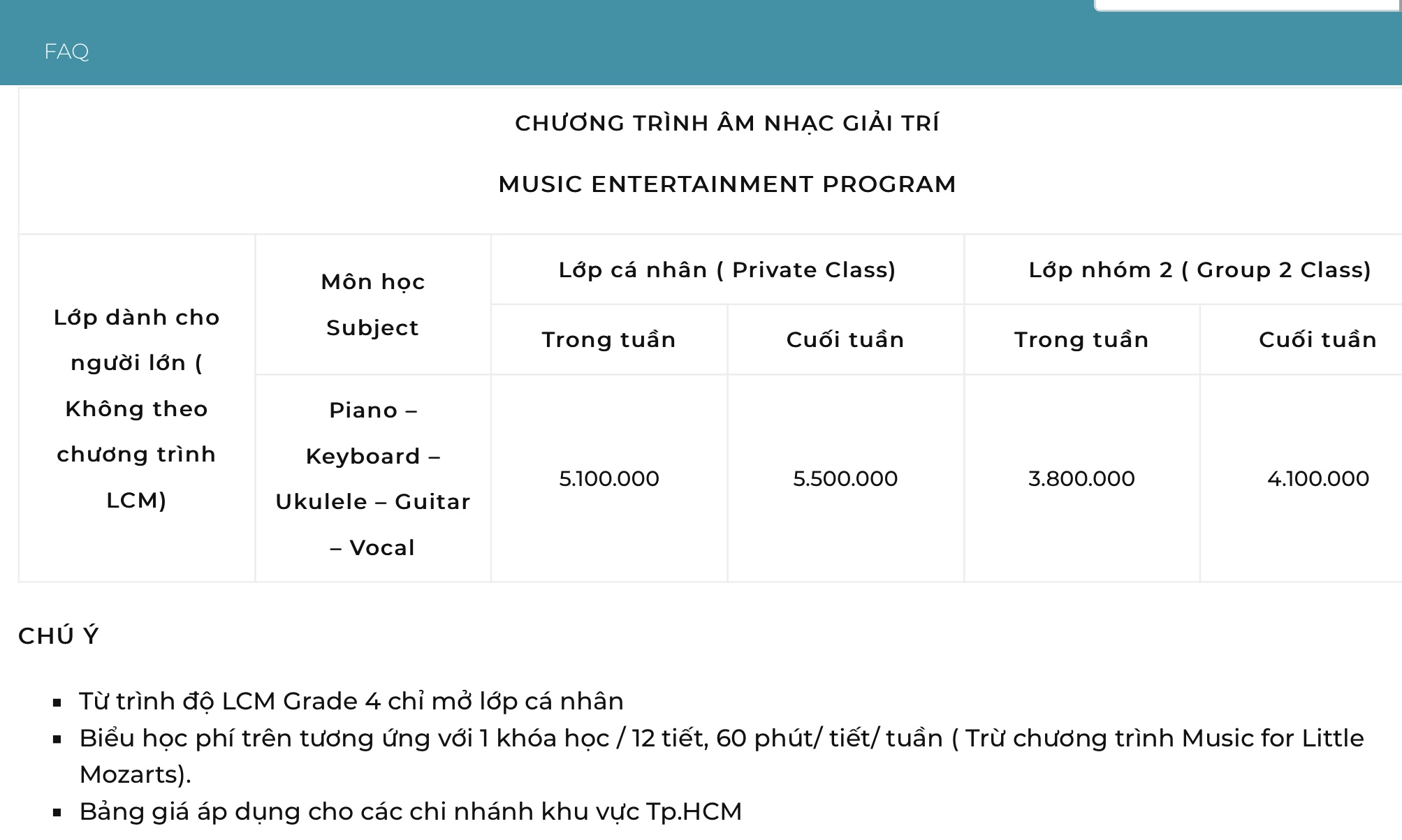 Đối với piano, mức học phí cũng tương tự, từ khoảng 4.5 triệu đến hơn 7 triệu đồng cho các cấp độ từ Step 1-2 đến Grade 6-7-8. Lớp nhóm có giá mềm hơn, từ 2.3 triệu đến 5 triệu đồng cho một khóa học 12 buổi. Việt Thương còn có các lớp âm nhạc giải trí dành cho người lớn với mức học phí khoảng 5 triệu đồng cho lớp cá nhân và 3.8 – 4.4 triệu đồng cho lớp nhóm 2 người.