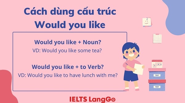 Cấu trúc “Would you like” là một trong những cách lịch sự để mời gọi hoặc đề nghị ai đó làm điều gì đó. Ví dụ, bạn có thể hỏi một người bạn: “Would you like to go to the beach this weekend?” điều này không chỉ thể hiện sự quan tâm mà còn giúp tạo thêm cơ hội giao lưu giữa các bạn.