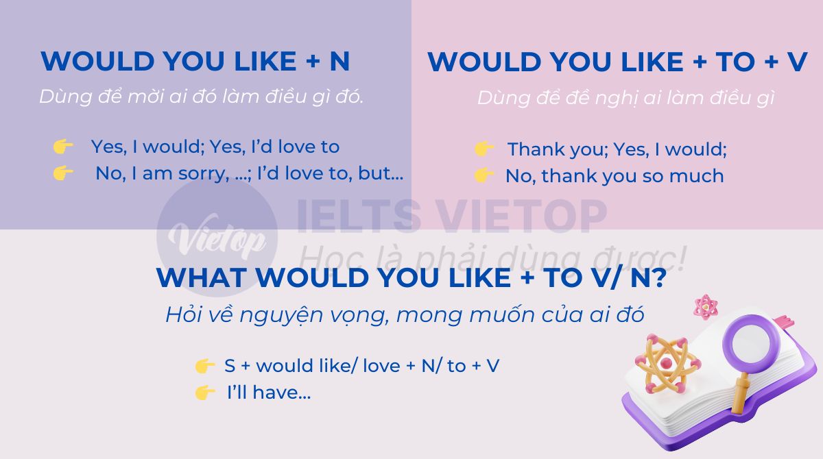 Trong giao tiếp tiếng Anh, câu hỏi “Would you like to…?” là một mẫu câu vô cùng quen thuộc và lịch sự khi muốn mời ai đó cùng làm một việc gì. Được sử dụng trong nhiều tình huống hàng ngày, cấu trúc này giúp người nói bày tỏ mong muốn, lời đề nghị hoặc lời mời một cách nhẹ nhàng, thể hiện sự tôn trọng đối phương. Bài viết dưới đây sẽ giới thiệu những mẫu câu phổ biến sử dụng “Would you like to…” với đa dạng động từ khác nhau, giúp bạn mở rộng vốn từ và tự tin hơn trong giao tiếp tiếng Anh hàng ngày.